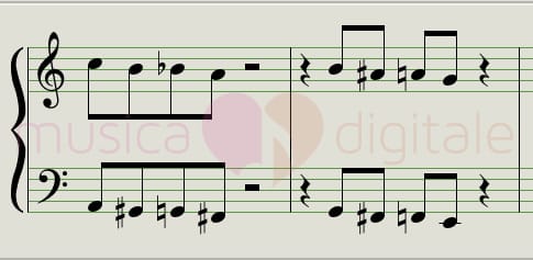 Qui lo vedi alla seconda battuta, tra il movimento di Sol-La-La#Si e quello, una decima sopra, di Si-Do-Do#-Re: